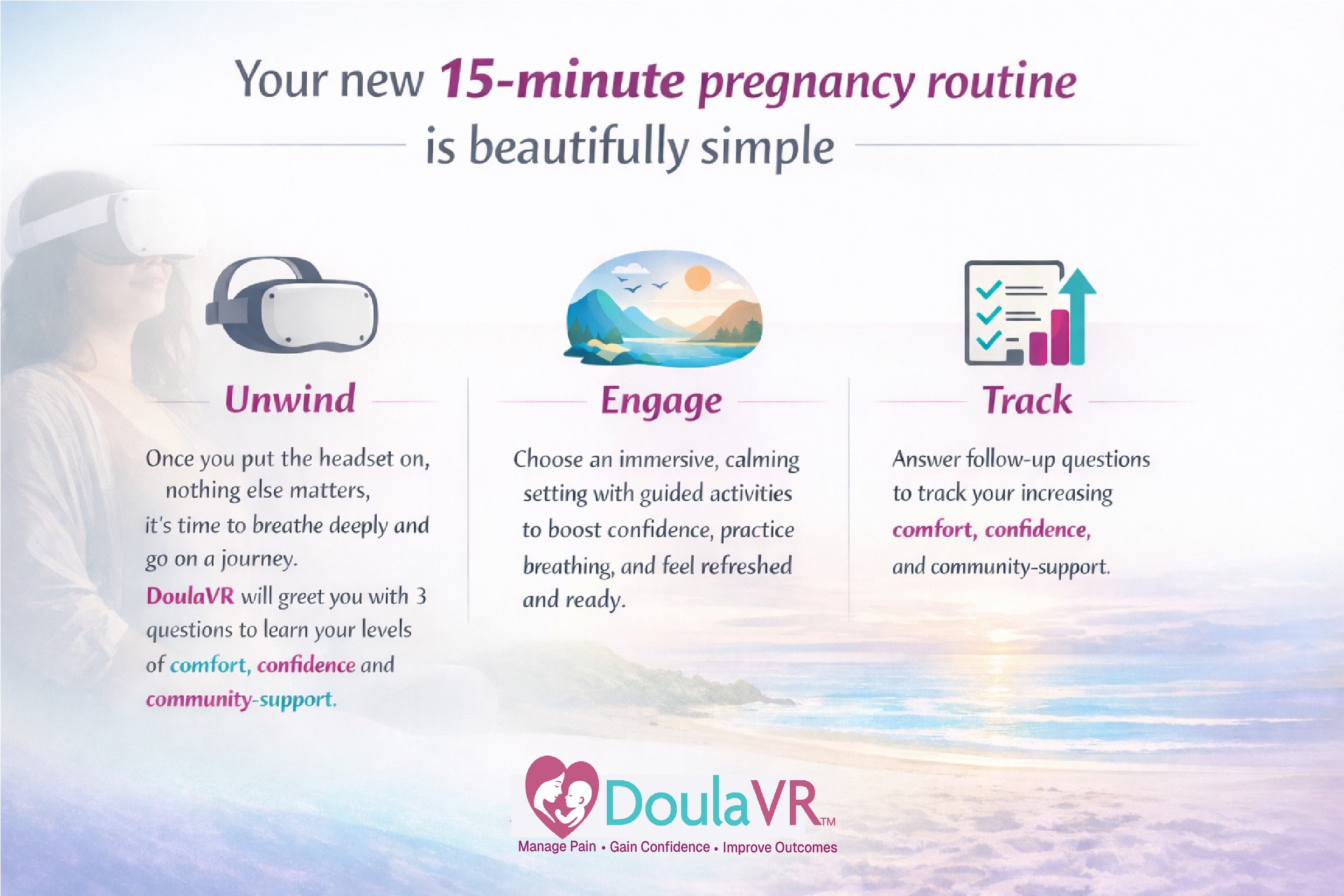 The intentional architecture of DoulaVR calms you through nature-inspired environments, to reduce anxiety, boost confidence and helps you manage pain.